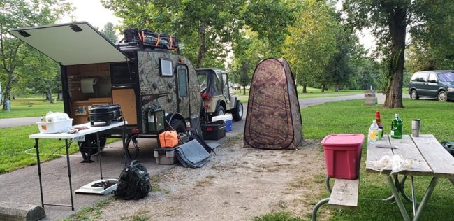 Jim has already worked out the kinks in his jeep-trailer setup, so he was ready to go (I think he’s been ready since about 2017 for another trip). Rumor has it Jim and Kelvin even tested out some cocktails on their first night of camping.