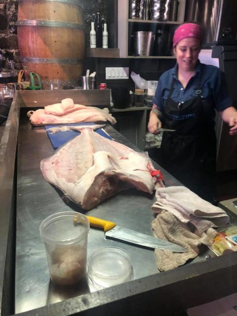Somehow, they got a sneak peak at a chef filleting a 100lb halibut, which the chef expects will feed 240 people.