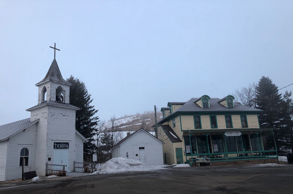 After driving through a set of gates (which we were surprised to see open), we encountered an old train depot, a few other buildings, then this general store and church.