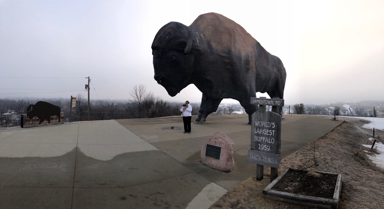 One of Jamestown’s claims to fame is its giant bison Sculpture, standing 26′ tall and 46 feet long. We decided that before we left town, we’d drive on over to the bison to get a ‘family’ photo. We figured we’d have the bison to ourselves, as who would be crazy enough to get up at day break on a 30 degree Sunday morning to look at a giant fake bison (besides us)?