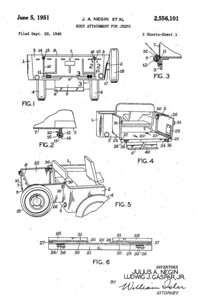 UPDATE: In 2019 I posted a patent filed in September 28, 1946, for a “body attachment”. Yesterday, on an unrelated search, I discovered the names of the same parties, under a different lawyer, related to a patent filed a month earlier (August 12, 1946)  for a “body extension” for a jeep. The second patent is more detailed (seen at bottom) than the early one. Both were approved on the same date: June 5, 1951. See most of the body extensions produced over the years in this post