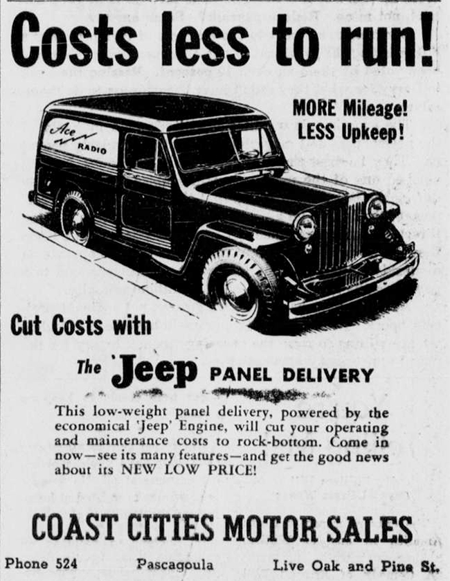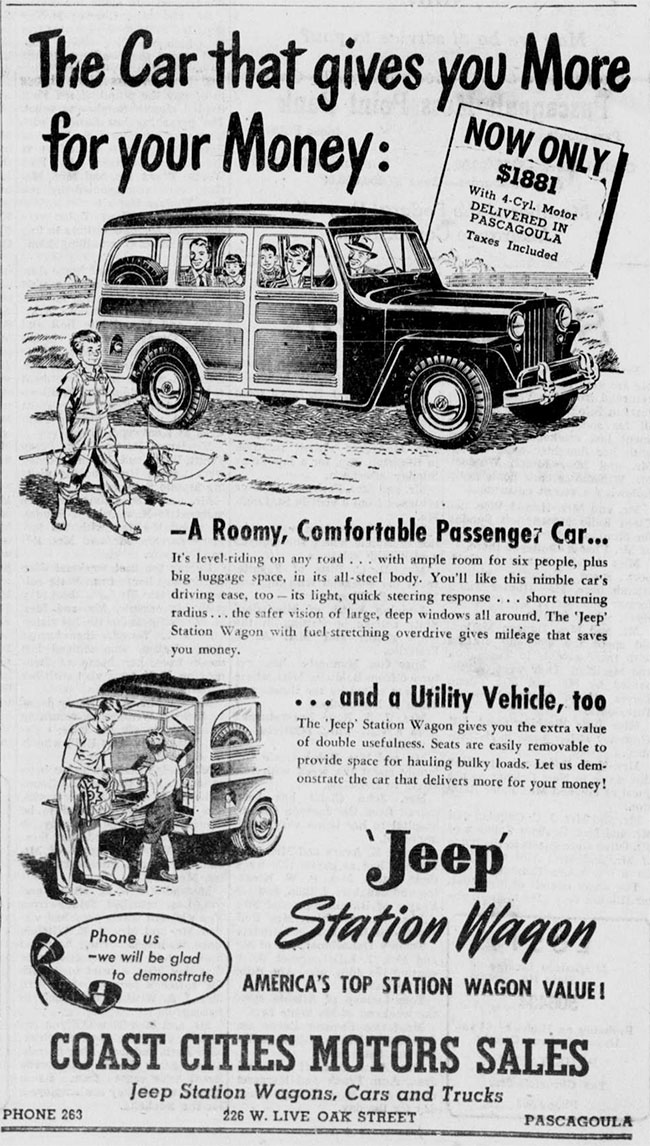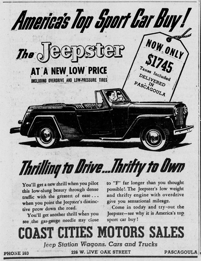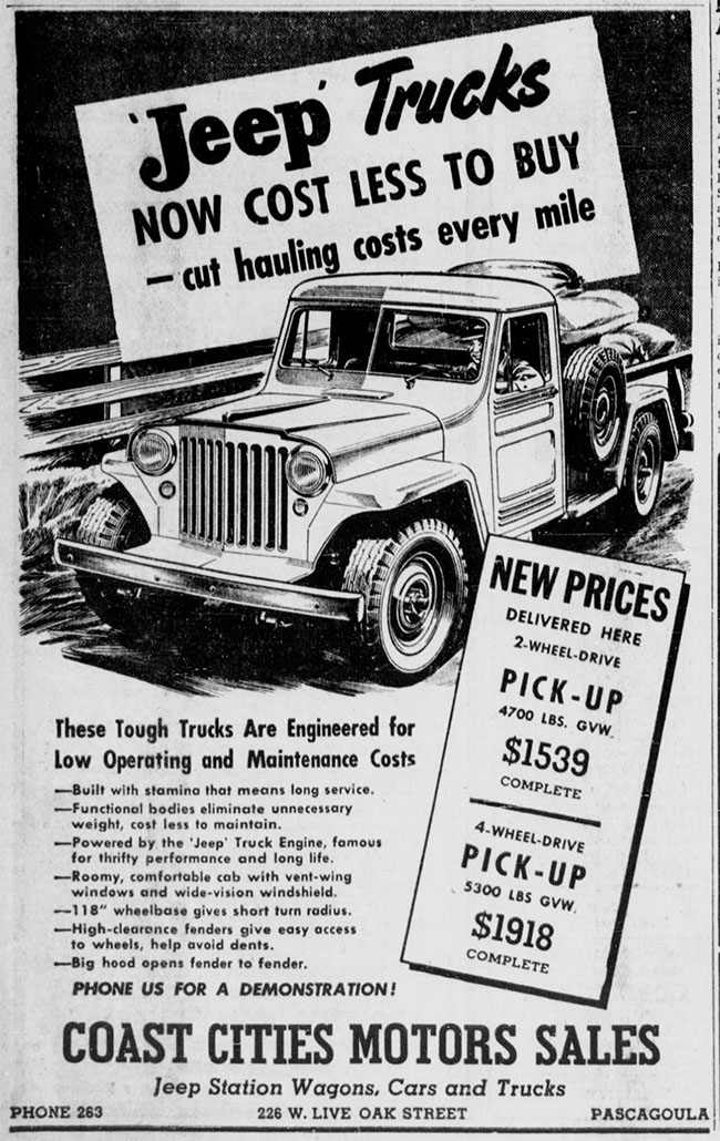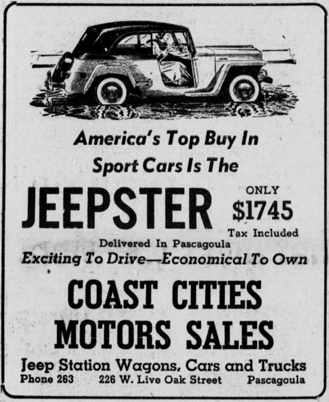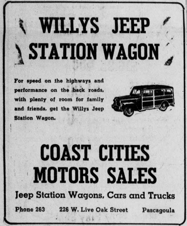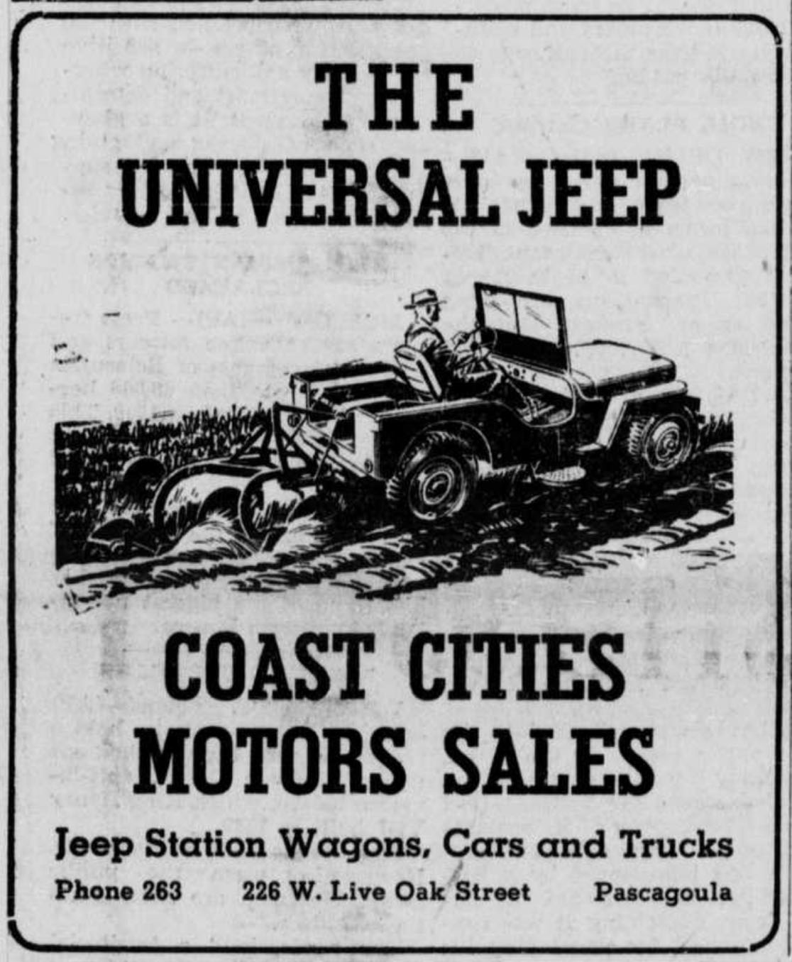Coast Cities Motor Sales announced the opening of the Jeep dealership in a December 10, 1948, article in the Pascagoula, Mississippi, Chronicle Star. Subsequently, for eleven months, from December 1948 through October 1949 they published ads in the same paper.