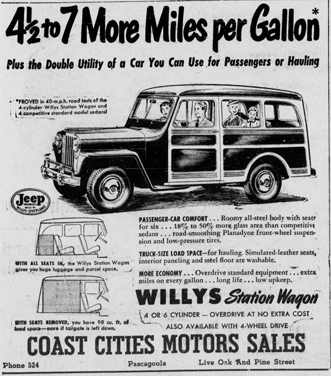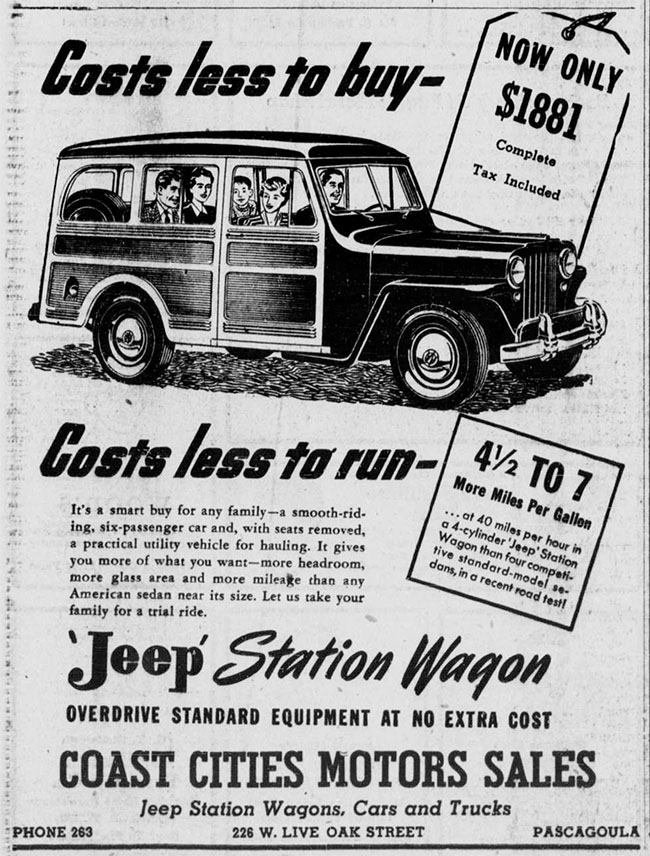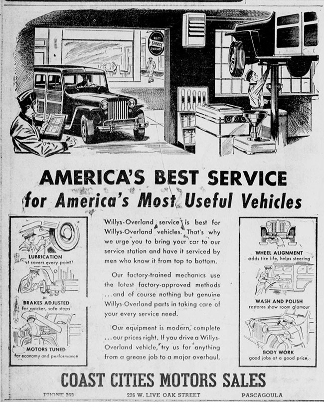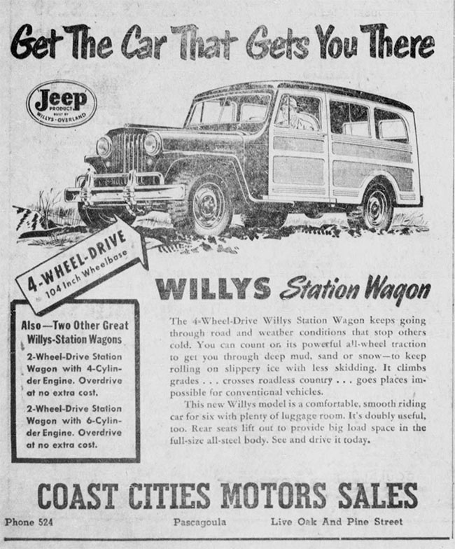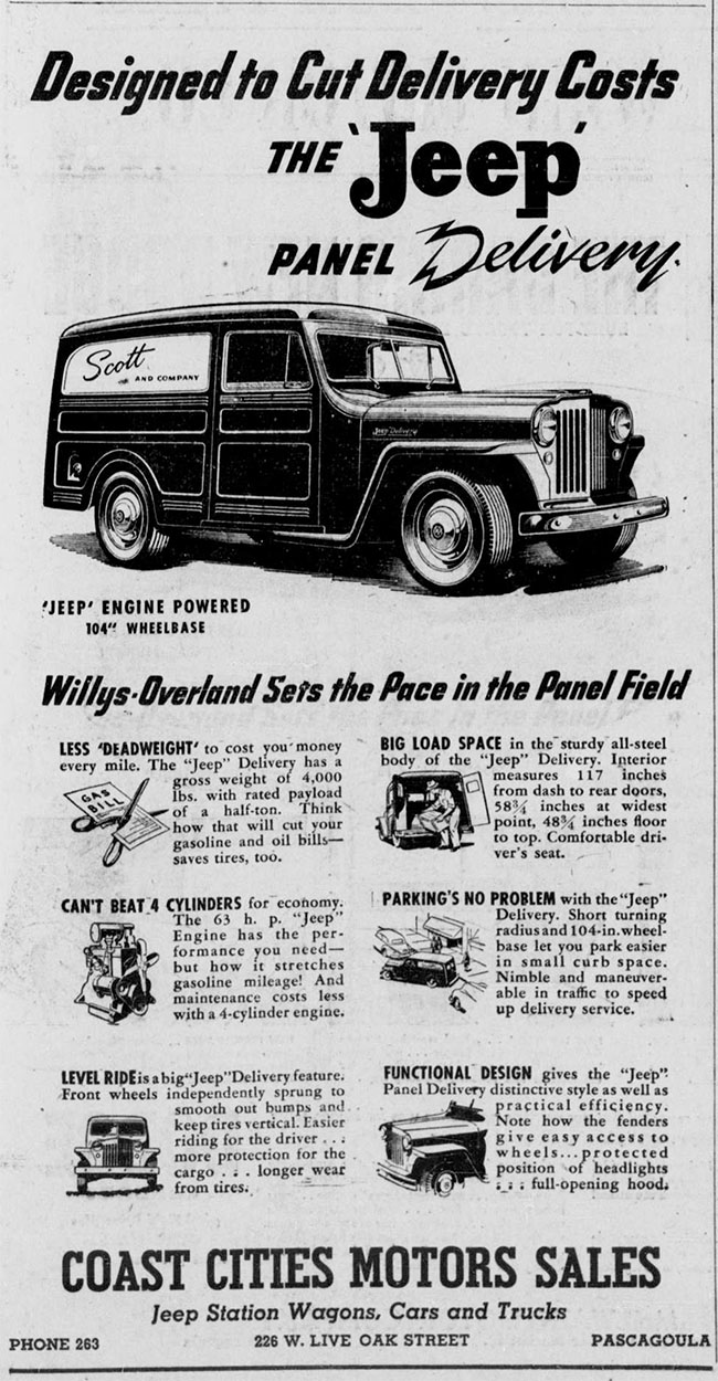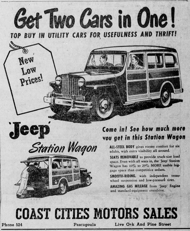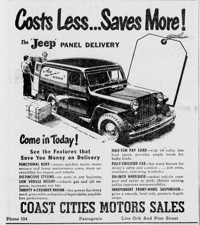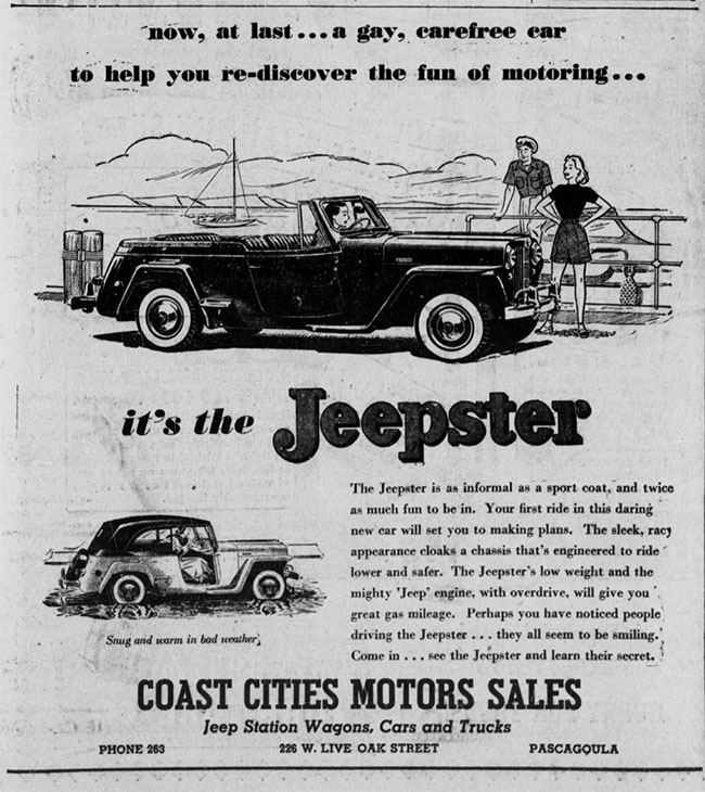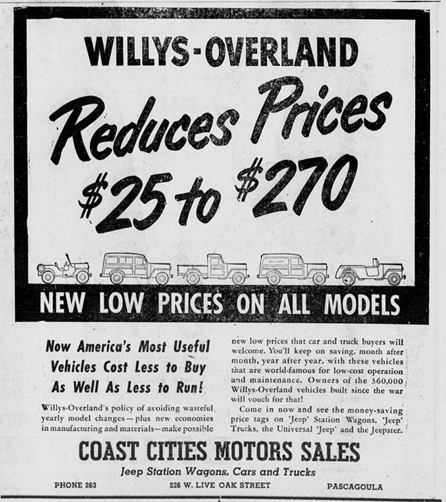 Coast Cities Motor Sales announced the opening of the Jeep dealership in a December 10, 1948, article in the Pascagoula, Mississippi, Chronicle Star. Subsequently, for eleven months, from December 1948 through October 1949 they published ads in the same paper.