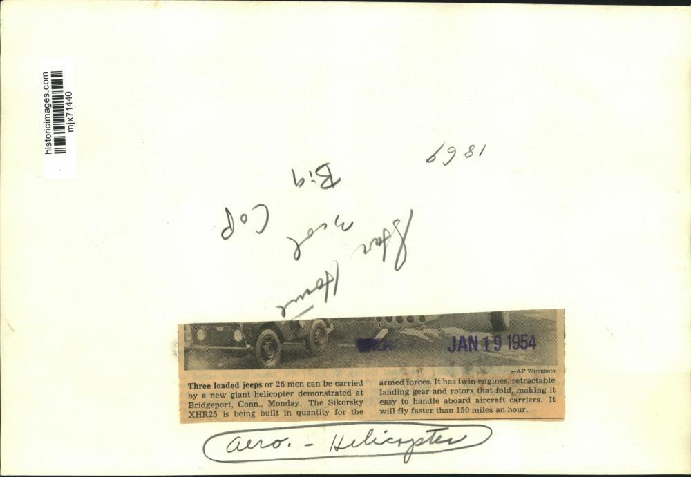 “1954 Press Photo Jeep being loaded into Sikorsky XHR25 helicopter, Connecticut. This is an original press photo. Three loaded jeeps or 26 men can be carried by a new giant helicopter demonstrated at Bridgeport, Connecticut, Monday. The Sikorsky XHR25 is being built in quantity for the armed forces. It has twin engines, retractable landing gear and rotors that fold, making it easy to handle aboard aircraft carriers. It will fly faster than 150 miles an hour. (Aero-Helicopter) Photo measures 10 x 7 inches. Photo is dated 01-19-1954.”