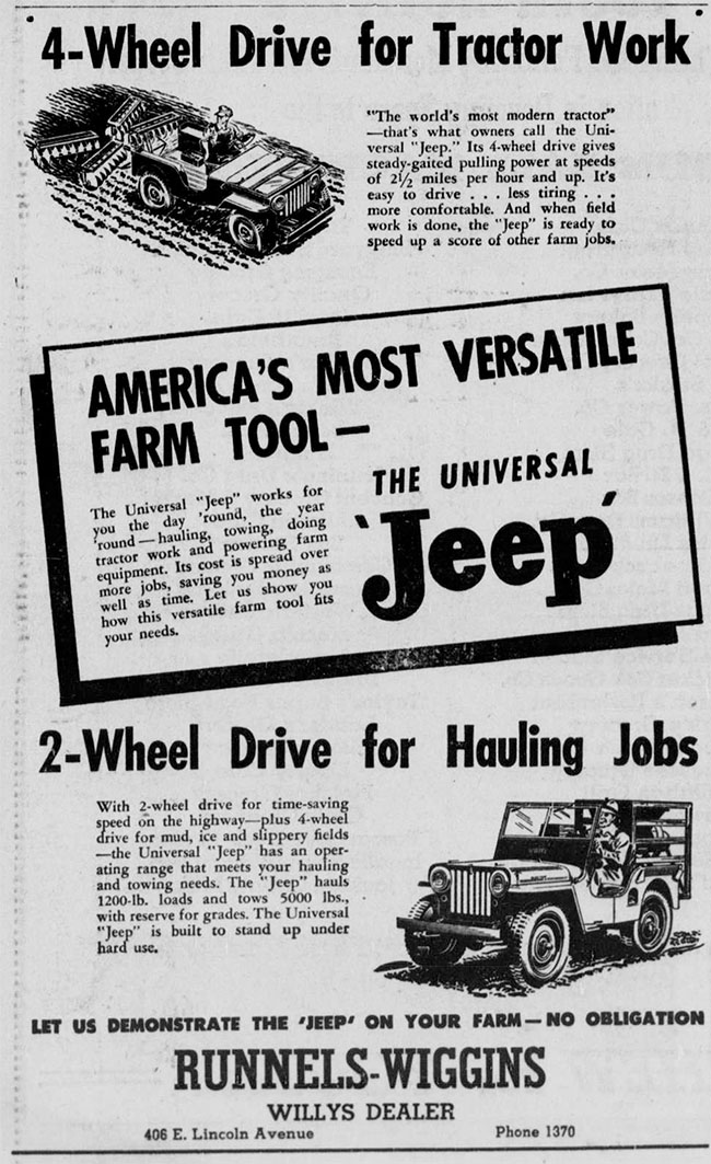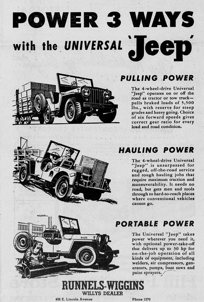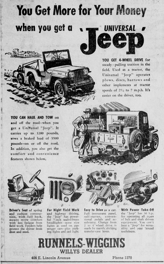 April 23, 1948 ‘Jeep’ 2 and 4 Wheel Drive Trucks Cut Hauling Costs (in this ad, Runnell is spelled with two “L”s):