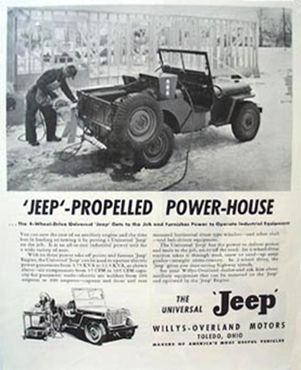 “Jeep Propelled Power-House Ad 1948 This is a June 1948 advertisement. It is a nice black and white ad for Willys-Overland Motors of Toledo makers of the Jeep. Pictures the Jeep on the job and it reads, The 4 wheel drive universal Jeep gets to the job and furnishes power to operate industrial equipment. In mint condition. Photo is taken through plastic and may show wrinkles or crookedness that is not in the ad. This magazine tear sheet measures 10 1/2″” wide by 13″” tall”