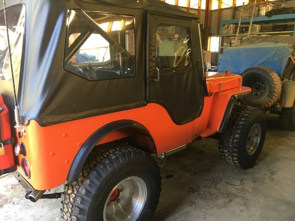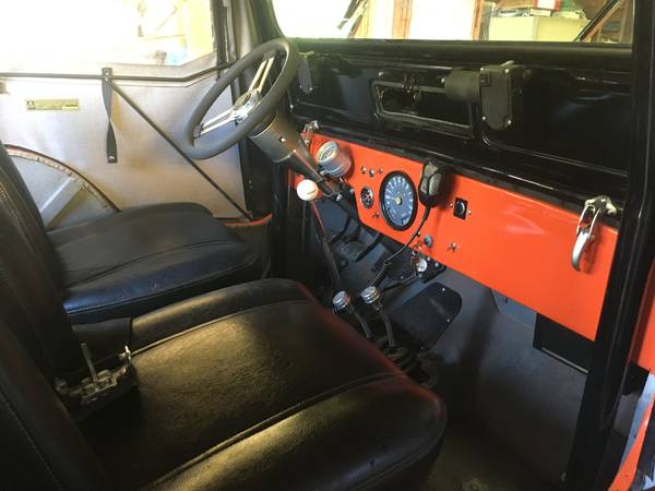 “Completely rebuilt, very clean and neat work, power steering, 4 wheel disc brakes, Chevy 327 with Angle milled vortec heads, steel roller rockers, Holley 650 Dual feed double pumper carb, Fuel regulator with gauge, Swing pedals, hydraulic clutch, center force clutch, Ford top loader 4 speed transmission, 2 stick Dana 20 transfer case, 44 rear differential with power lock, 30 front differential, 4.56 gears, aluminum radiator, electric fan, all new wiring, Autometer gauges, 6 point roll cage, RJS seatbelts, full top and Bimini top, C.B. Radio, tilt steering column, aluminum battery box, heater, less than 1000 miles on engine, runs strong. $15,000.00”