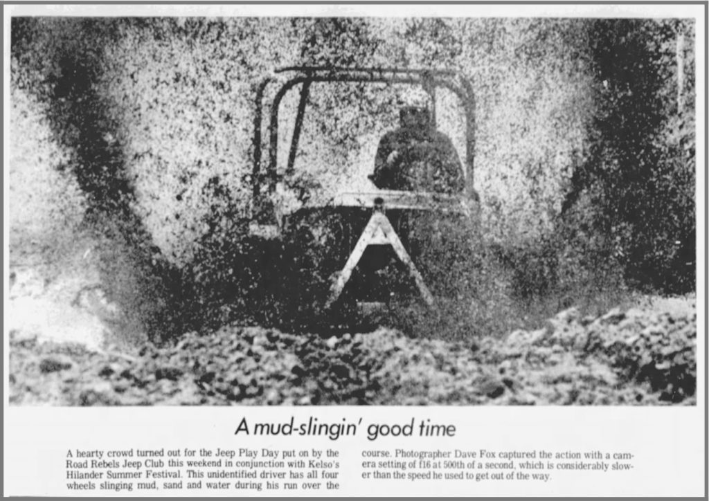 “A hearty crowd turned out for the Jeep Play Day put on by the Road Rebels Jeep Club this weekend in conjunction with Kelso’s Hilander Summer Festival. The unidentified driver has all four wheels slinging mud, sand and water during his run over the course. Photographer Dave Fox captured the action with a camera setting of f16 at 500th of a second, which is considerably slower than the speed he used to get out of the way.”