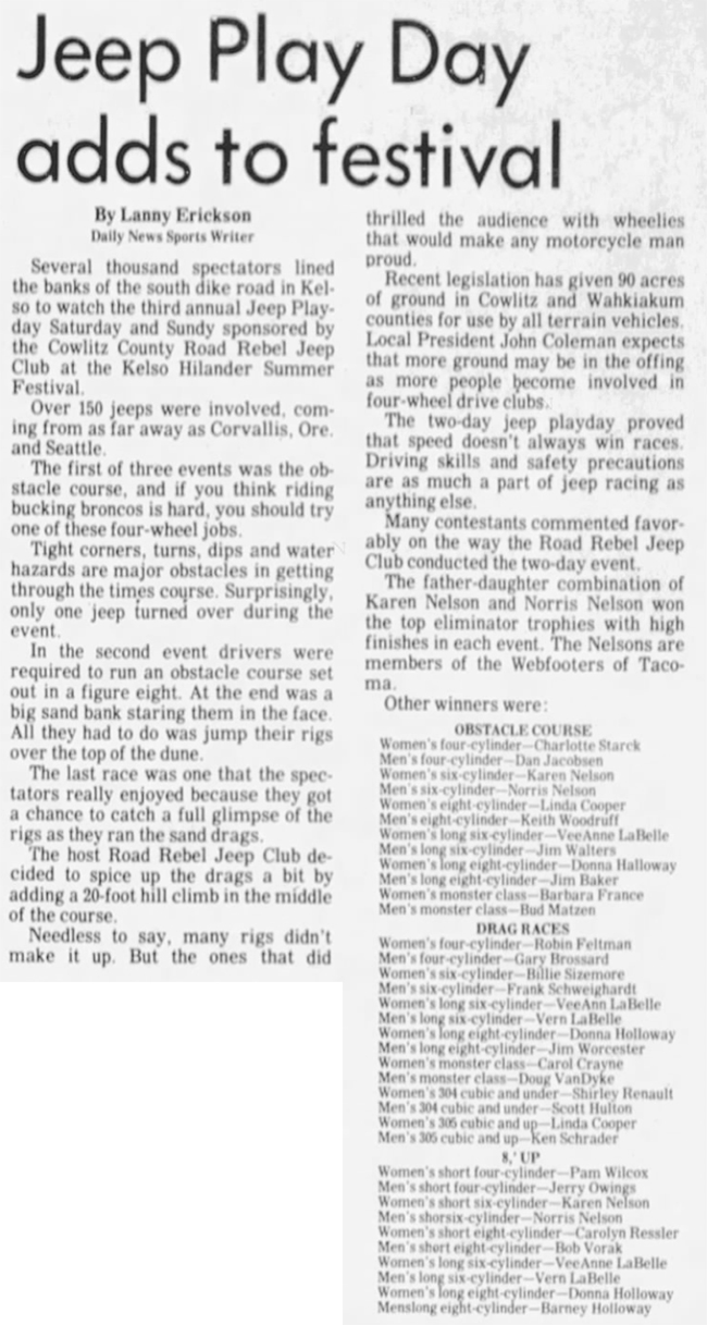This photo and article appeared in the July 09, 1973, issue of the Longview Daily News. I don’t remember the Road Rebels Jeep Club nor can I remember its insignia. The tow bar on the front suggests this jeep was likely a trail and race jeep, if not also a road jeep. It was common to see the family jeep show up at races into the early 1980s. It doesn’t take too many breakdowns of the family jeep while racing to convince owners to build race-only jeeps.