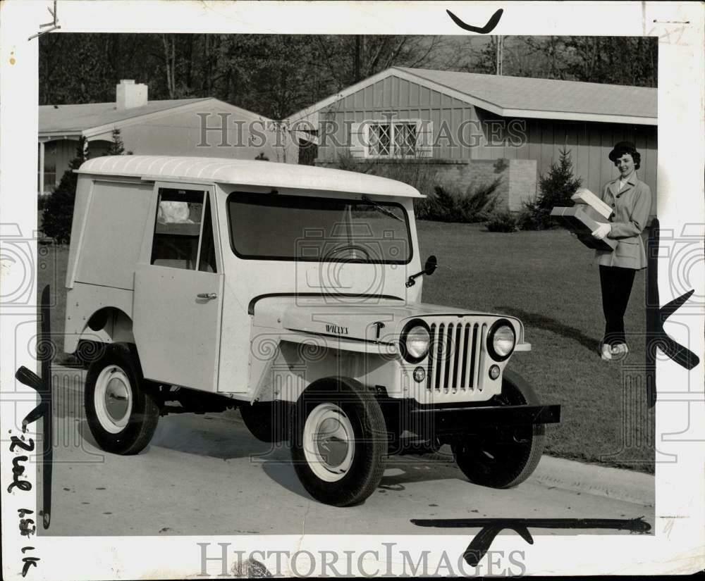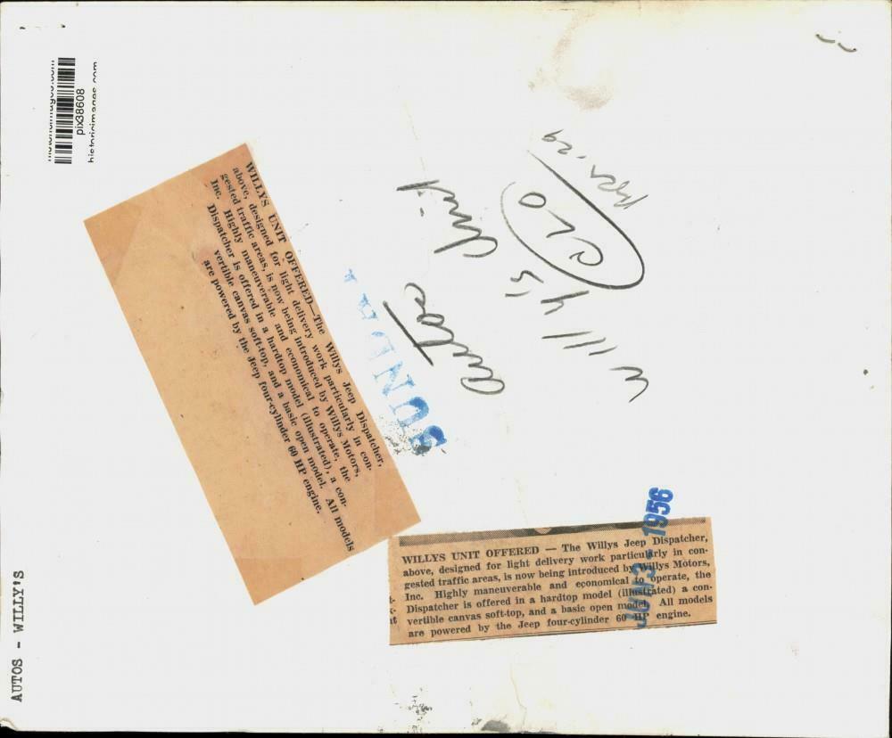 “This is an original press photo. Autos-Willy’s. Willys Jeep Dispatcher, above, designed for light delivery work particularly in congested traffic areas, is now being introduced by Willy’s Motors, Incorporated. Highly maneuverable and economical to operate, the Dispatcher is offered in a hardtop model (illustrated) a convertible canvas soft-top, and a basic open model. All models are powered by the Jeep four-cylinder 60 horsepower engine.Photo measures 10 x 8.25inches. Photo is dated 6-3-1956.”