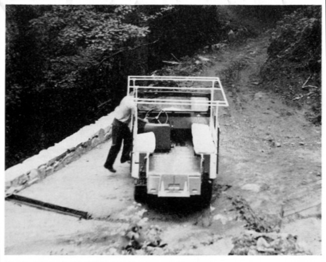 UPDATE: Started as a private endeavor, Chimney Rock was a tourist attraction for most of the 20th Century (more history here). In 1963 a Jeep Trail was added to the Chimney Rock and a tour jeep began ferrying tour groups up the mountain. The tour company had three modified CJ-6 tour jeeps. This photo was likely taken between 1963 and 1977, when the jeep trail became a walking trail. In 2006 Chimney Rock became a North Carolina State Park.