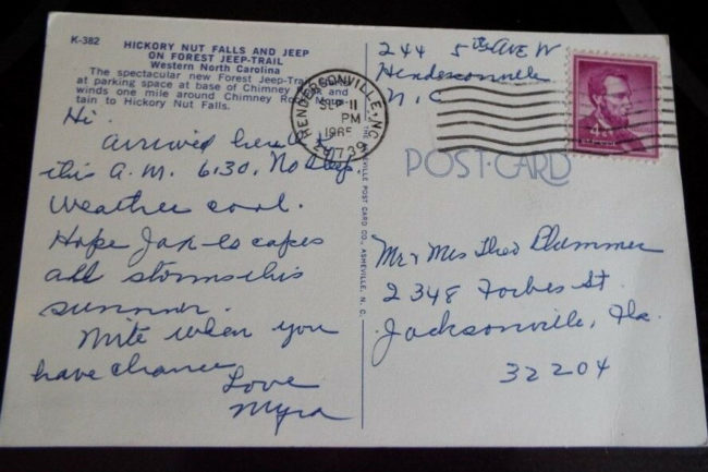 “This is a used postcard with writing and postmark. Has surface, corner & edge wear, light corner crease, overall good condition.”