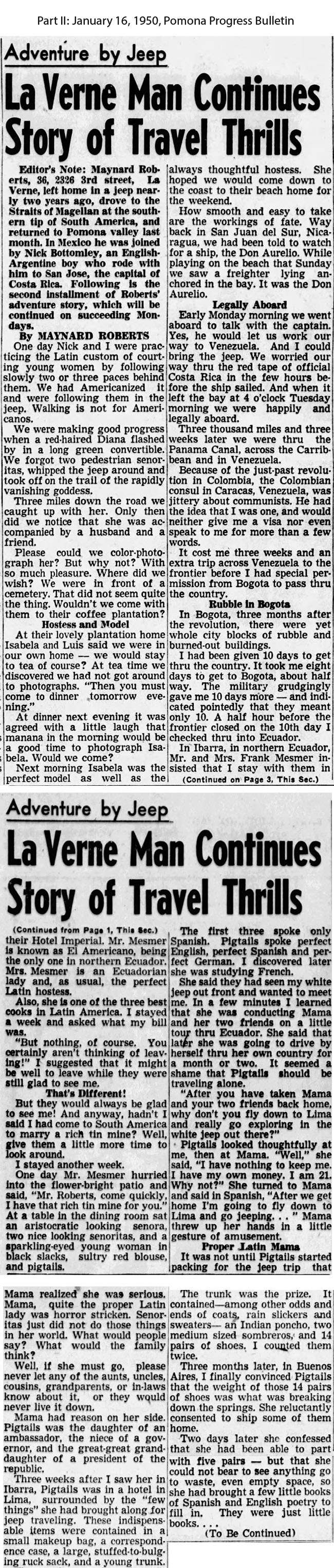 Part one of his adventure appeared in the January 09, 1950, issue of the Ponoma Progress Bulleting, split into two sections.