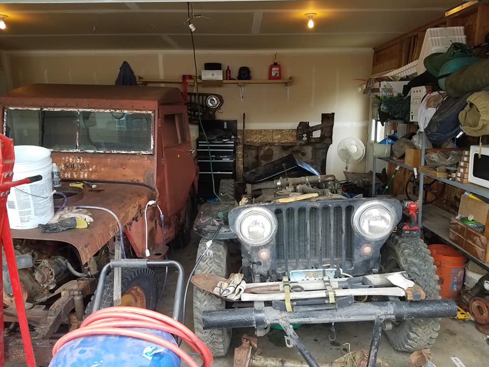 “1947/1948 willys cj2a project 99% original and complete. Functional before disassembly. Was originally a Standard gas service vehicle from big timber. plenty of extras. Engine is a L134 go devil (ww2 gpw) runs and supposedly fresh rebuild. Start of PTO front and rear. Extras: axles, tranny and t case, 5 tires and wheels, fenders, grill, guages, gas tanks, window, hood, heater, generator, steering etc etc New hat channel, most rust has been replaced with fresh steel. Needs: some more body work Springs, wiring and some break work. 1500 OBO or trade.”