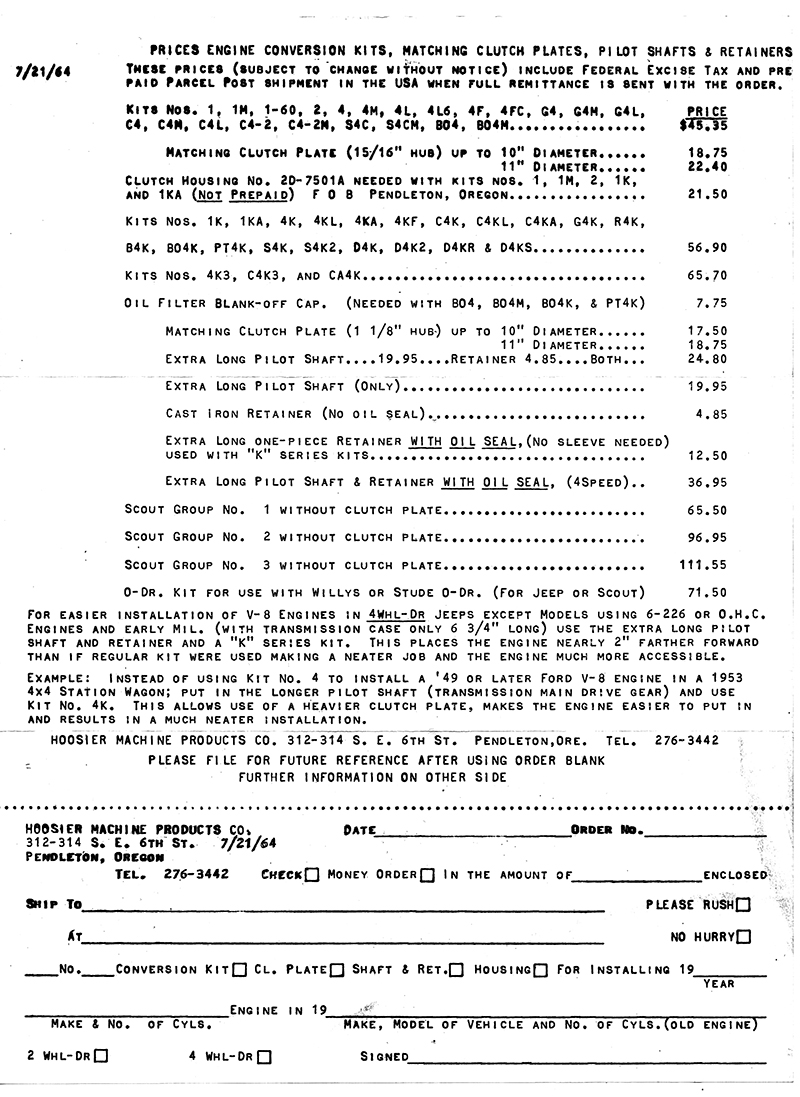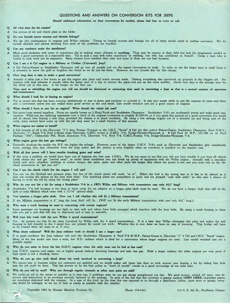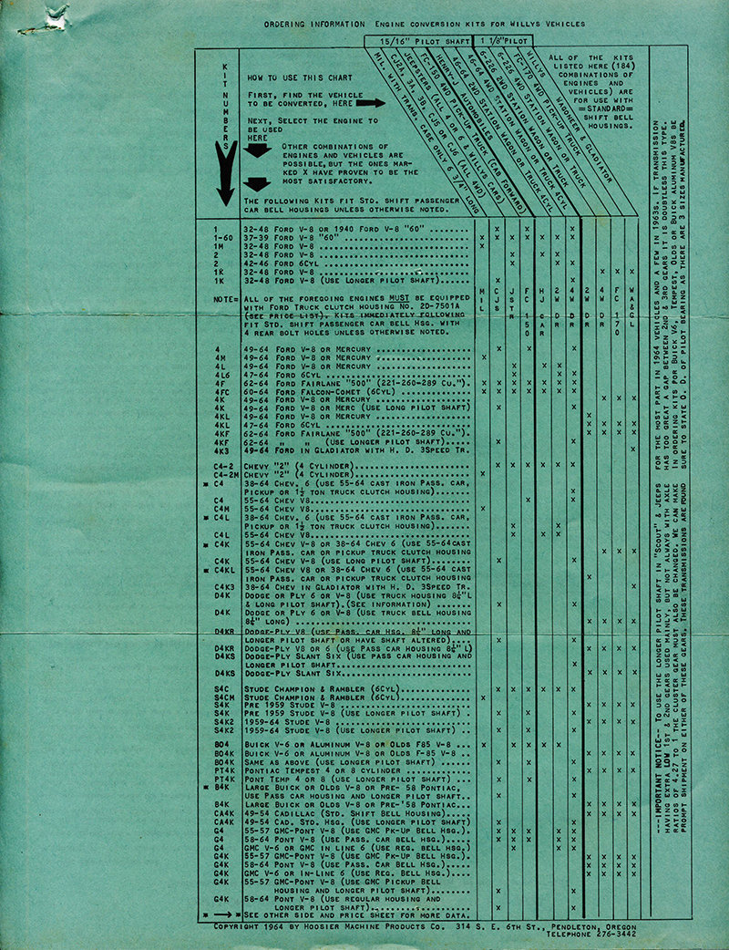 ORIGINALLY PUBLISHED JUNE 6, 2019: In the early 1960s, Hoosier Machine Products out of Pendleton, Oregon, (just an hour south of me) began selling conversion kits for jeeps. The company’s kits allowed the repowering of jeeps using Ford, Chef, GMC, Mercury, Dodge, Studebaker and Pontiac engines. That’s a pretty impressive, wide range of options, especially for a company out of Pendleton, which was pretty remote at the time. But, given the long distances Pendleton owner’s jeeps had to travel to reach other towns and the existence of the nearby, steep Blue Mountains, which provided endless jeeping possibilities, perhaps there was a reason Pendleton jeeps need more power?