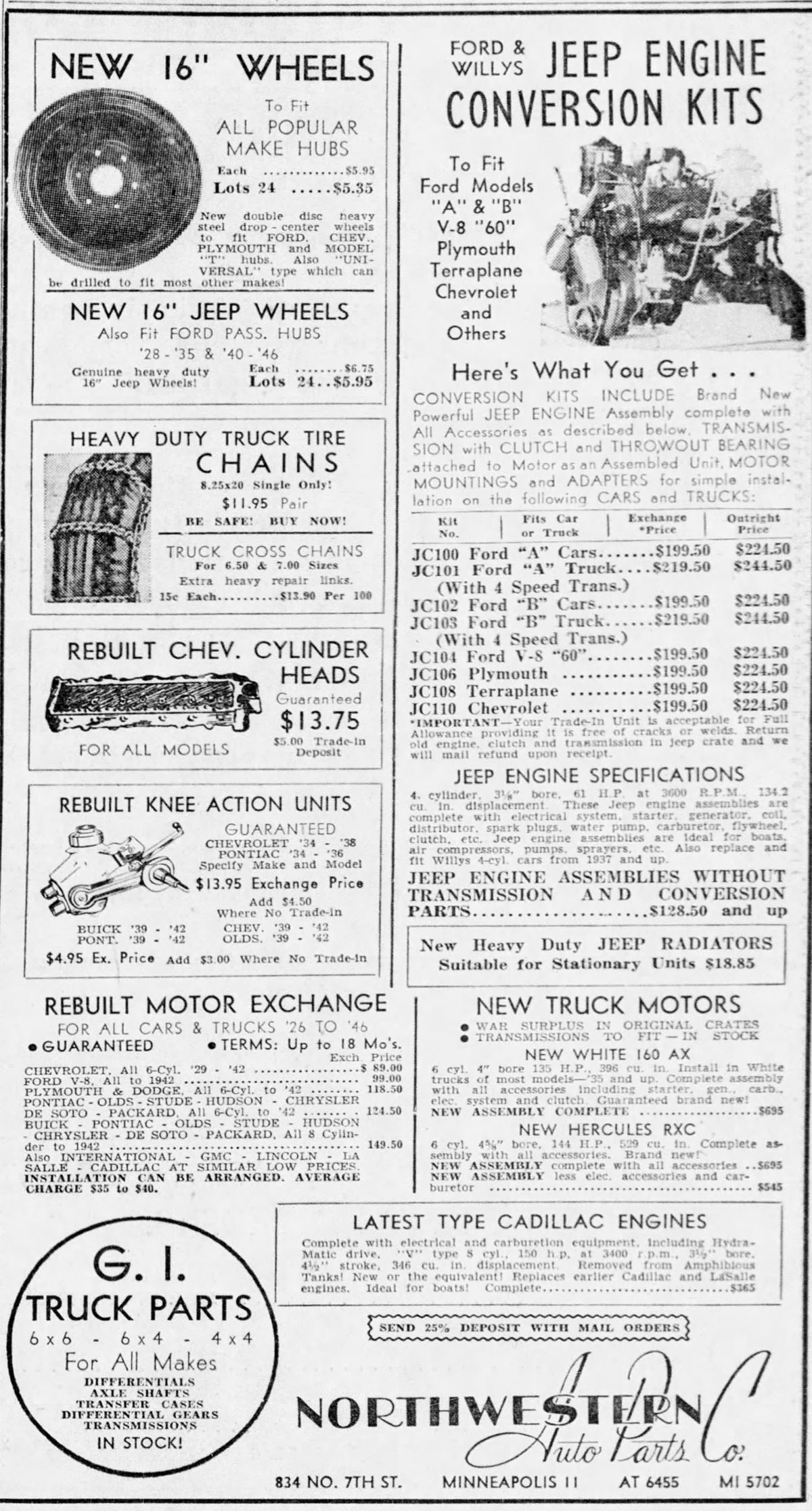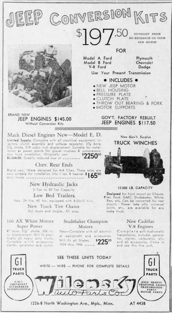 This Northwestern Auto Parts and Wilenskey Auto parts ads in the January 05, 1947, issue of the Star Tribune out of Minneapolis highlighted engine kits that allowed a jeep engine and transmission (which was included with the purchase), along with the necessary mountings, to be installed into certain Ford, Plymouth, and Chevrolet vehicles. I wasn’t aware there were kits design to do this.