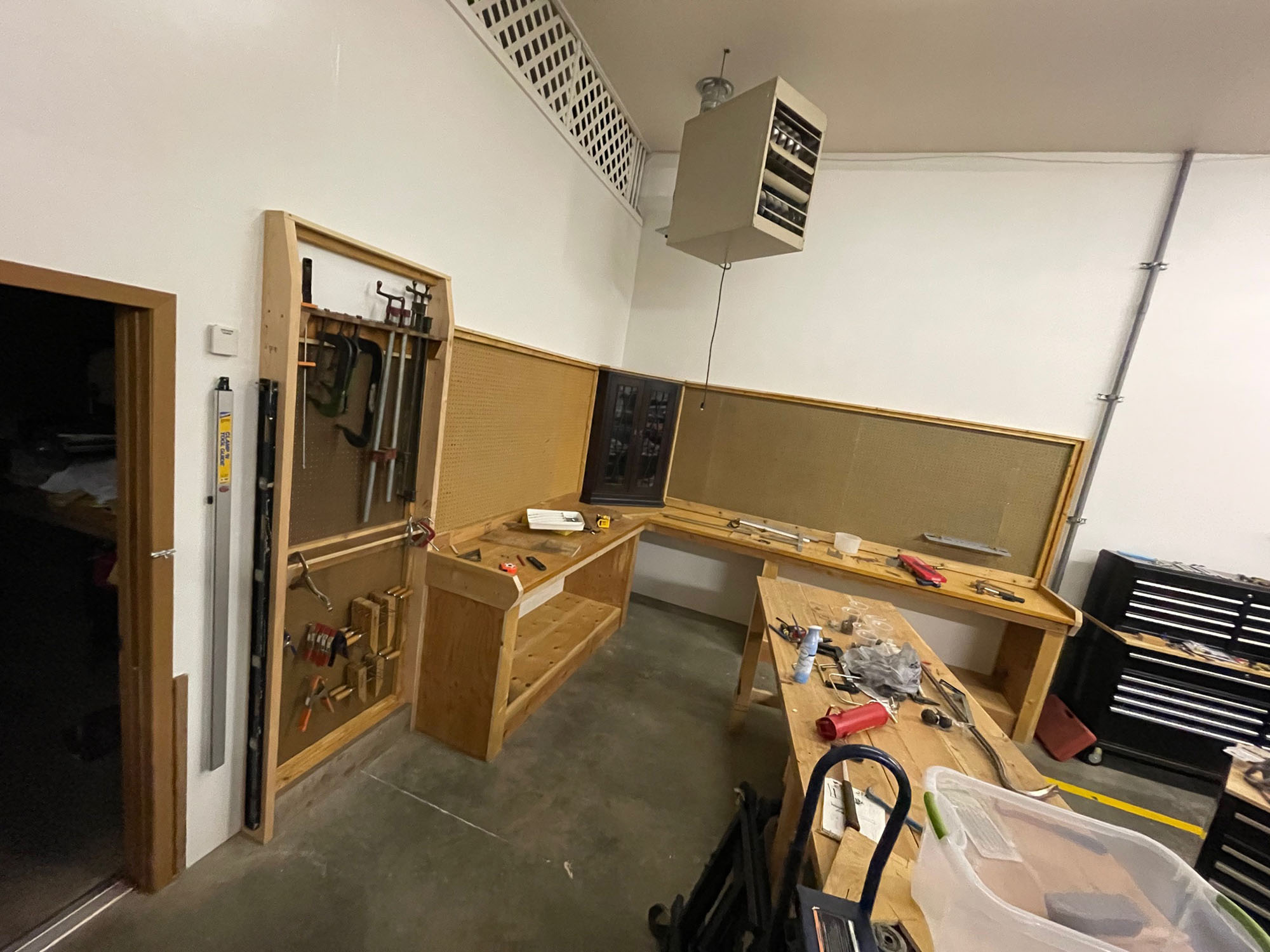 My next project is a large, rolling work bench that will be the same height as the work benches. After that, I need to hang some lights over the benches to provide better light. Here’s a quick look.