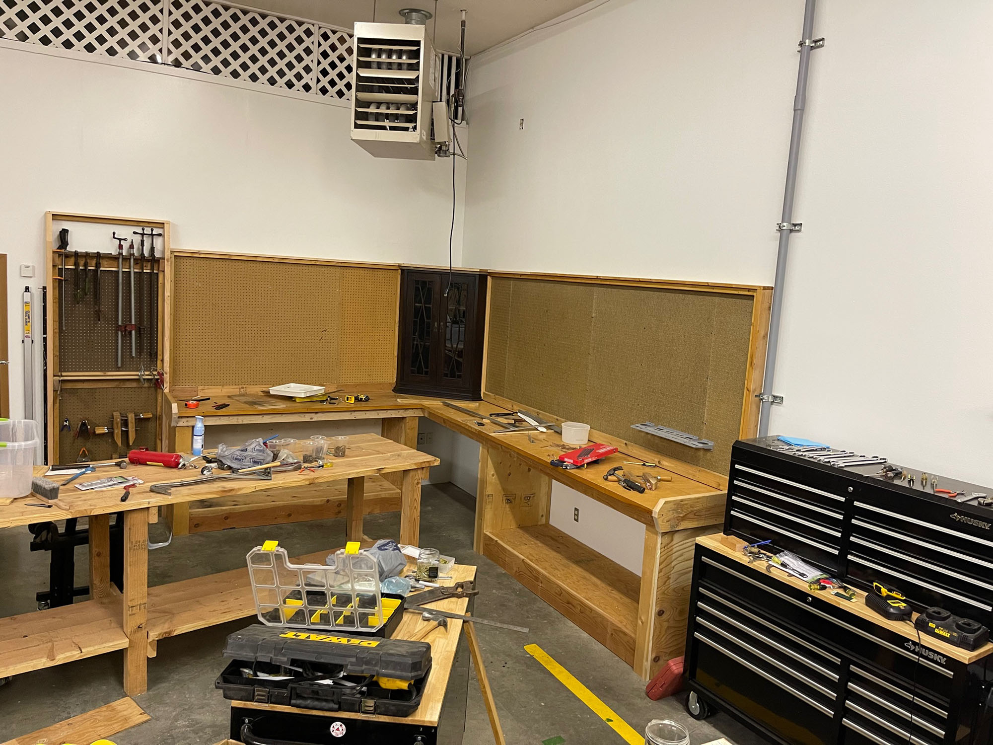 Looking great Dave. Hanging shop lights might be challenging with those way high ceilings. Maybe you can run a tensioned cable across the shop from one wall to the other high enough to hang the shop lights on ? Then you could run the wires back to wall outlets and not get too fancy with pulling wires inside your ceilings . Just an Idea. Have fun!! Oh did you ever get those spacers off the race jeep ?