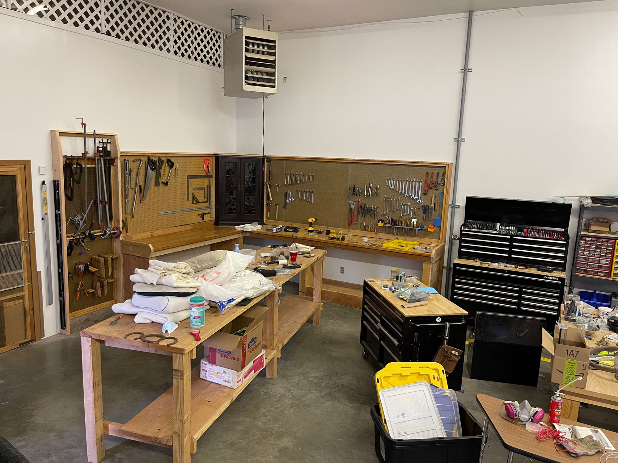 Originally posted August 19, 2021: In between everything else, I’ve been slowly working on my workbenches and places to hang tools, etc. One bench is about 8 ft long and the other 14 ft. They are made almost entirely out of recycled wood and reused screws. Now, I can start hanging tools and organizing the remainder into tool boxes.