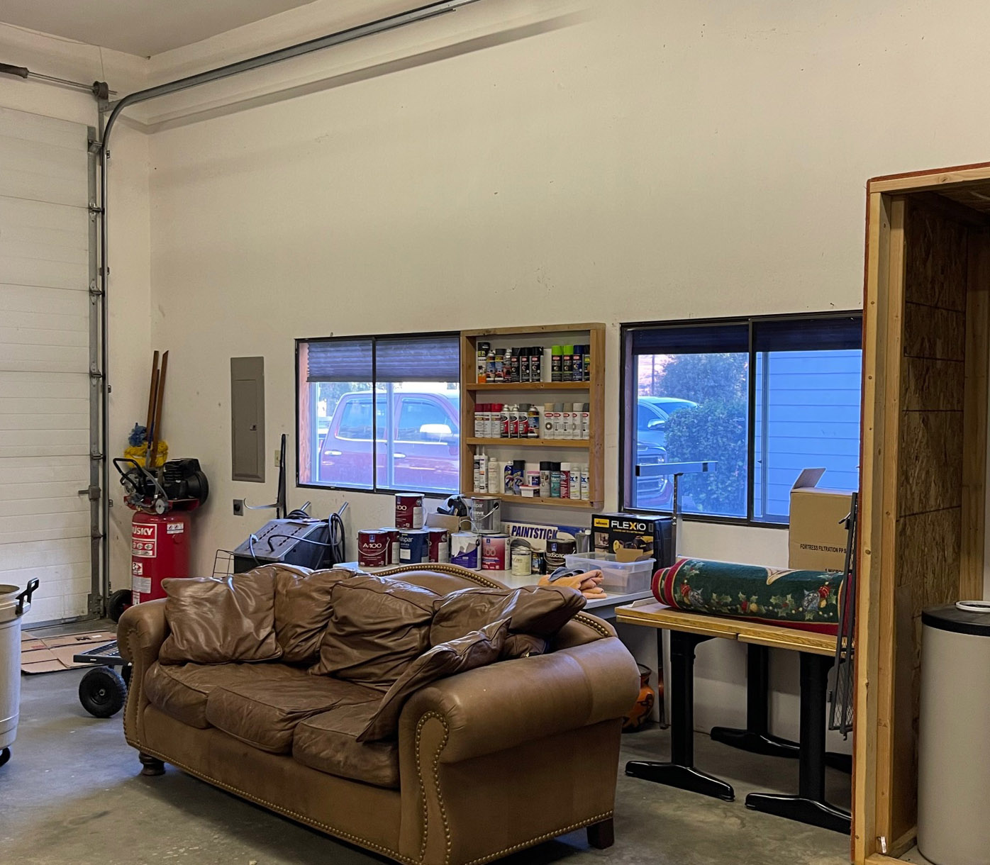 Steve: That plush carpet was left over from the previous property owner (he left several carpets, so plenty of carpet left for “jeep pee”). As for that couch, it needs to go. It will just get dusty in the garage and it’s not all that comfy in my opinion (but it does look comfy). As for Ann, she’s getting better by the day and feeling much, much better, thanks to the stomach surgery.