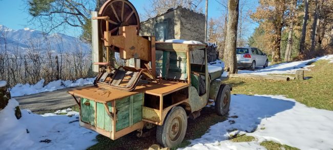 These Facebook photos from Alfano Mucci of Italy show a customized jeep with a bandsaw. The work was done by his father. Pretty cool!
