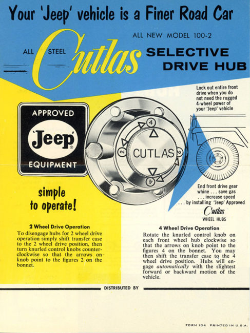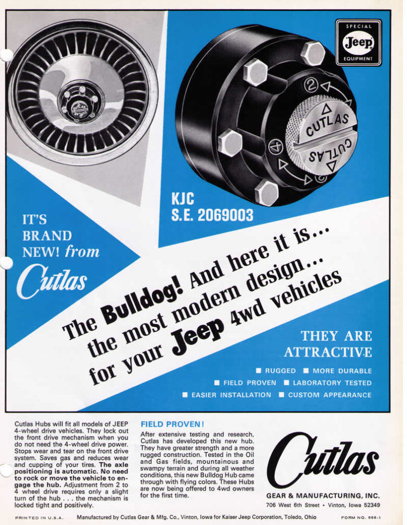 The hub Bob spotted was on a later model jeep, so maybe Cutlas offered this version of the hub for a short time? It seems to be an further iteration of the Bulldog; unfortunately, I have no brochures that document it.