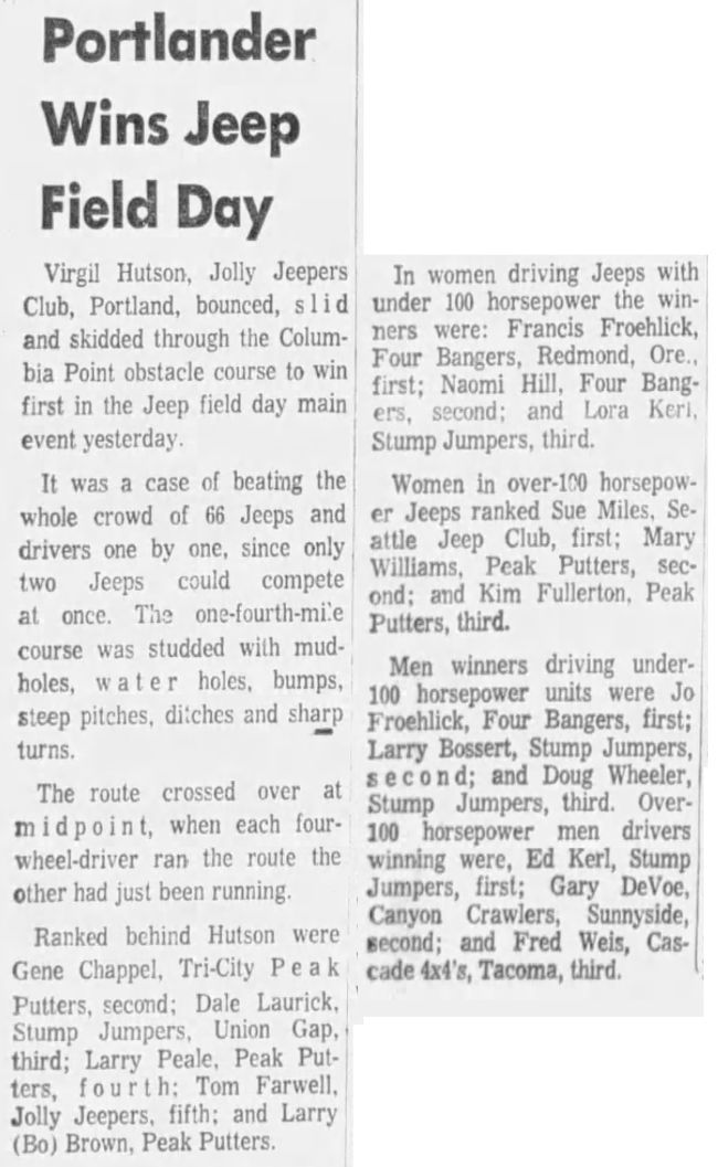 Jeep races used to be a near weekly event during the summer back in the 1970s. Below are examples of Pacific Northwest 4Wheel Drive Association (PNW4WDA) races held between 1967 and 1970 near my local Eastern Washington community.