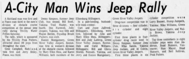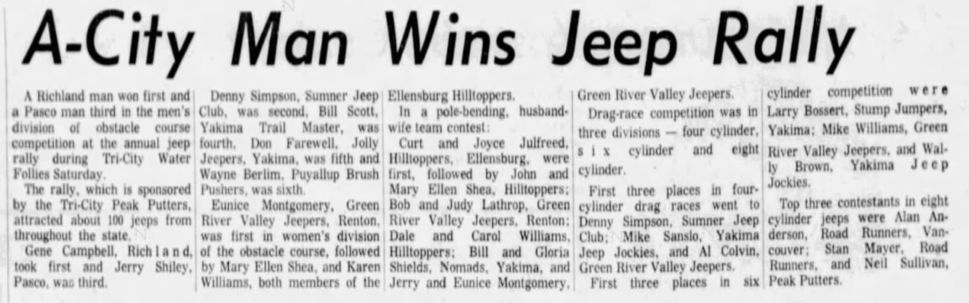 It’s hard to believe gived the growth in the Tri Cities (an area consisting of three cities–Richland, Kennewick, Pasco, all separate by rivers) in southeast Washington that races were held near Columbia Point. Now, that area is either wetlands, parks, or homes. Here are several articles with names I’m familiar with. These races were held in conjunction with the annual Water Follies celebration, an event still being held, though without jeep races, though the unlimited hydros still run.