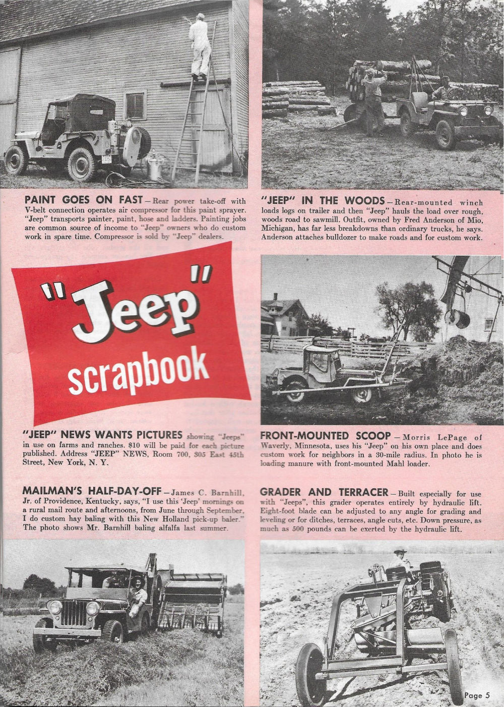 On the same page is a reference to custom baling. That was a major use of the Jeep here in the midwest. On page 7 is a Jeep equipped with a TMC hydraulic lift and bulldozer blade. You can read about them at https://www.farmjeep.com/transport-motor-company-tmc-hydraulic-lift/