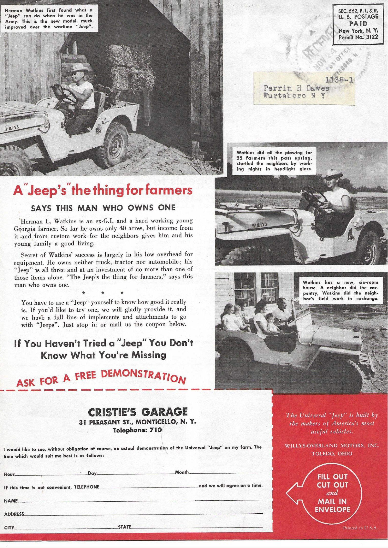 Thanks to Jan in the Netherlands for sharing a scanned version of the late 1940s issue of ‘Jeep’ News Volume 1, Number 6.  The “Cristie’s” at the top of the banner is a reference to Cristie’s Garage out of Monticello, New York.