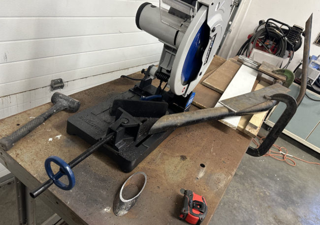 Trying to get this angle just right on the front portion of the bars was tricky. So, I cut the back bar first to the optimal length, then dropped the front of the bar over the edge of the table until the tube was level. Then used the flat edge of a carpenter square to draw a straight edge on the bar.