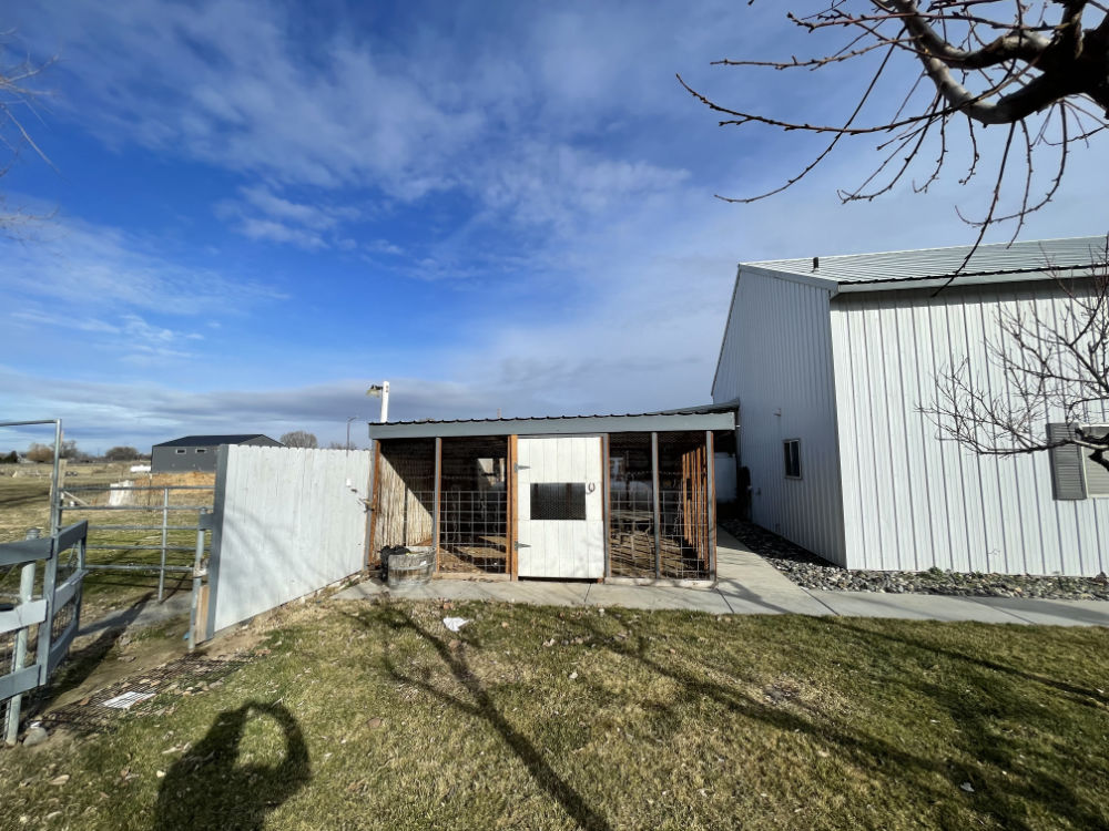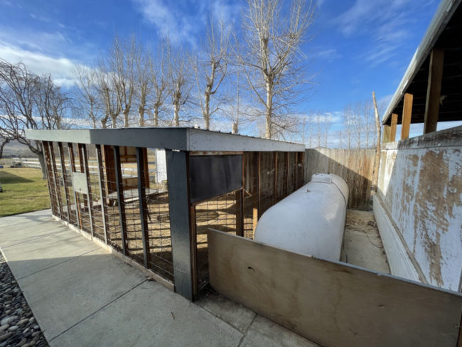 Note the railroad rail holding the right gate in place. That rail was from my grandfather’s mine in northern Idaho (Palisade Mine). The rail sat outside our garage for 40 years. I welded some 5/8″ pins onto the bottom and slid them into holes in a treated 4×4. I added two tabs to the top so the door bolts to the rail. Two thumb screws hold the door to the rail.