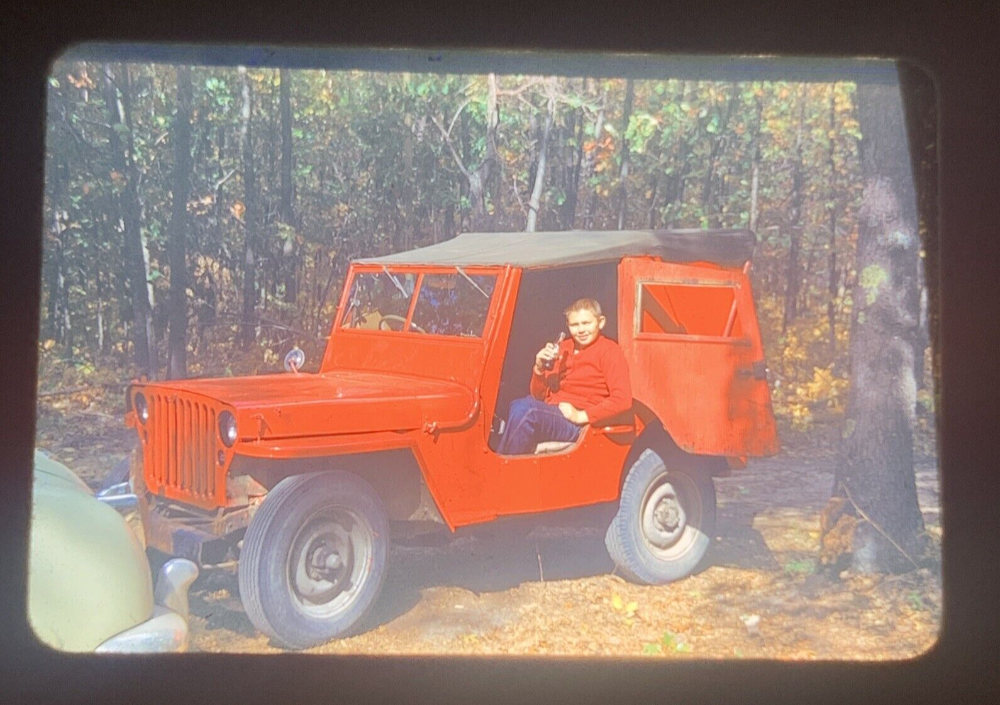 - Red GPW with suicide wood(?) door and soft top with boy seated in driver’s seat
