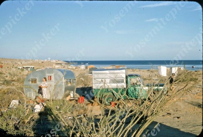 - Truck with canopy pulling trailer parked at campsite among beach dunes