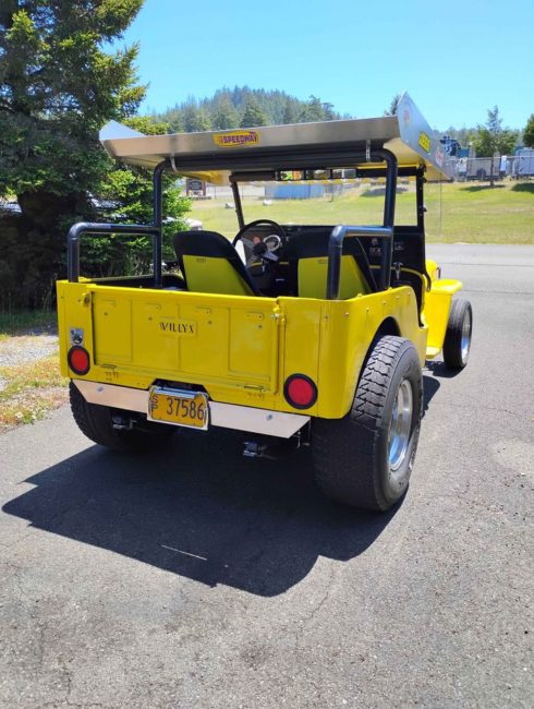 “48 CJ 2A Willy’s Jeep Street rod, 77 Buick 231 V6, 350 TH 78 AMC 20 rear end W/3.55 gears, Brand New seats, Brand New 7 gal. Aluminum tank, Brand New yellow paint, brand new LED taillights, brand new tach, plus gauges, Aluminum Wing on top (sort of like a Sprint car style), brand new windshield, brand new fender well headers W/12″ cherry bomb mufflers and turnouts, newly polished centerline front and rear (3″-10″), 1970 MGB frontend moved ahead 16″(so ahead of grill like the old Sand drag Jeeps) which gives 11″ disc and rack and pinion steering and independent suspension. All this means not 4×4, also has power breaks, drives and handles great along with this comes a tandem axle enclosed 16′ trailer to use as a garage if you don’t have one. Ready for lots of fun, this jeep needs nothing 10,500.00 OBO”