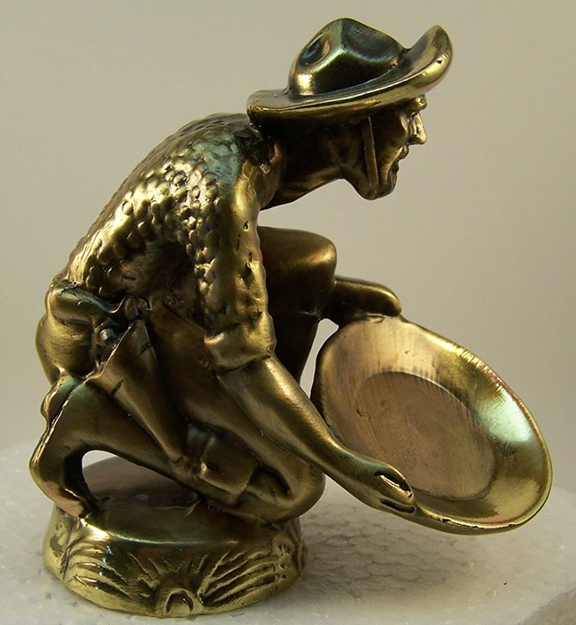 Over the last decade, I occasionally saw vintage jeeps with bronze casted placer gold miners on the hood. For years I’ve wondered about where these originated. They turn out to have an interesting history. Moreover, different castings over the years has led to slightly different designs.