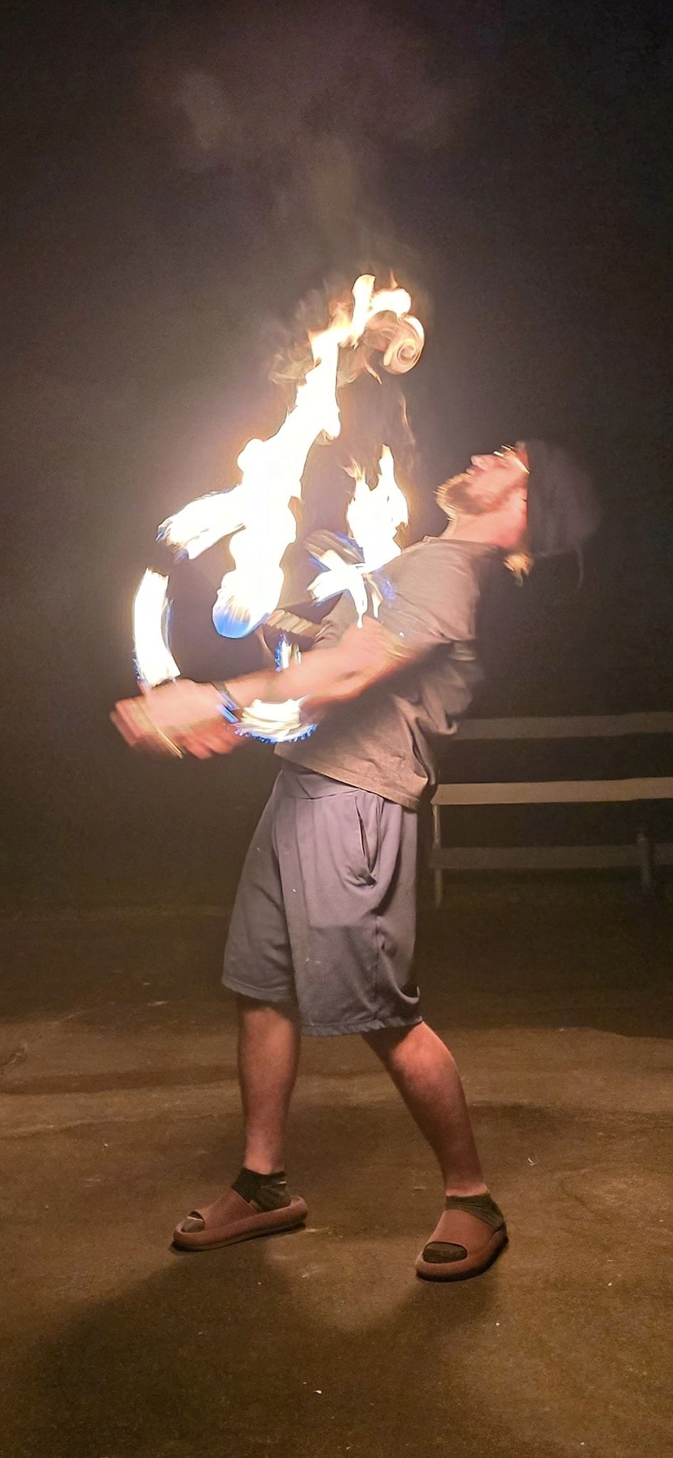 On Friday night, one of the relatives got out his fire dancing items and entertained us at the fire pits. He’s been spinning fire for more than a decade (though he’s only been part of the family for just over a year). So, this is a neat treat.