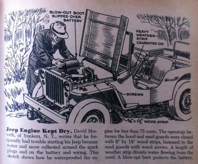Dexter spotted this 1949 issue of Popular Science at a local swap meet the other day. A reader of the magazine sent in an idea for waterproofing a jeep for only $.75. Not a bad price. Probably wouldn’t cost much more today. Note that it was in 1949 that the CJ-3A came out with a mini gutter to distribute water similar to the role the weather stripping hint accomplishes. I still have one of those gutters if anyone needs it.