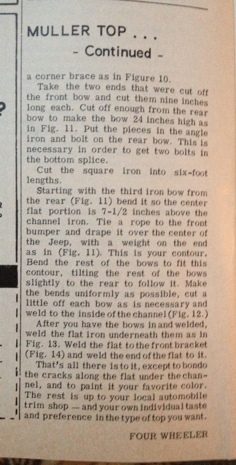 I discovered these directions for the Muller Custom Top in the August 1965 issue of Four Wheeler Magazine that we’ve seen on nicely modified Fresno area Jeeps. I’m considering building one of these for Biscuit and selling my Kayline.