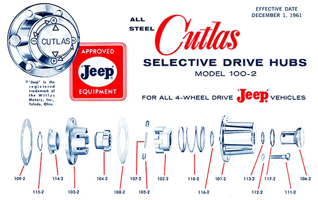 John recently rebuilt a set of Cutlas Selective Hubs, the type with the knob that rotates to engage and disengage the hub. There appear to be at least two styles of these hubs, one with a flat top and one with a groove, so that a tool (or improvised tool) can be used to help engage, disengage the hub.