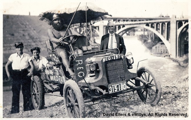 In the picture above, we appear to have Willis Ray Willey in his 1904 REO, the first year that the Ranson E. Olds Automobile Company built a car.  This photo was taken in 1933 (note the ’33 on the license plate).  The photo is taken with the Monroe Street bridge and the Spokane Falls in the background.  Willey planned to drive this car from Spokane to the 1933/1934 World Fair in Chicago.