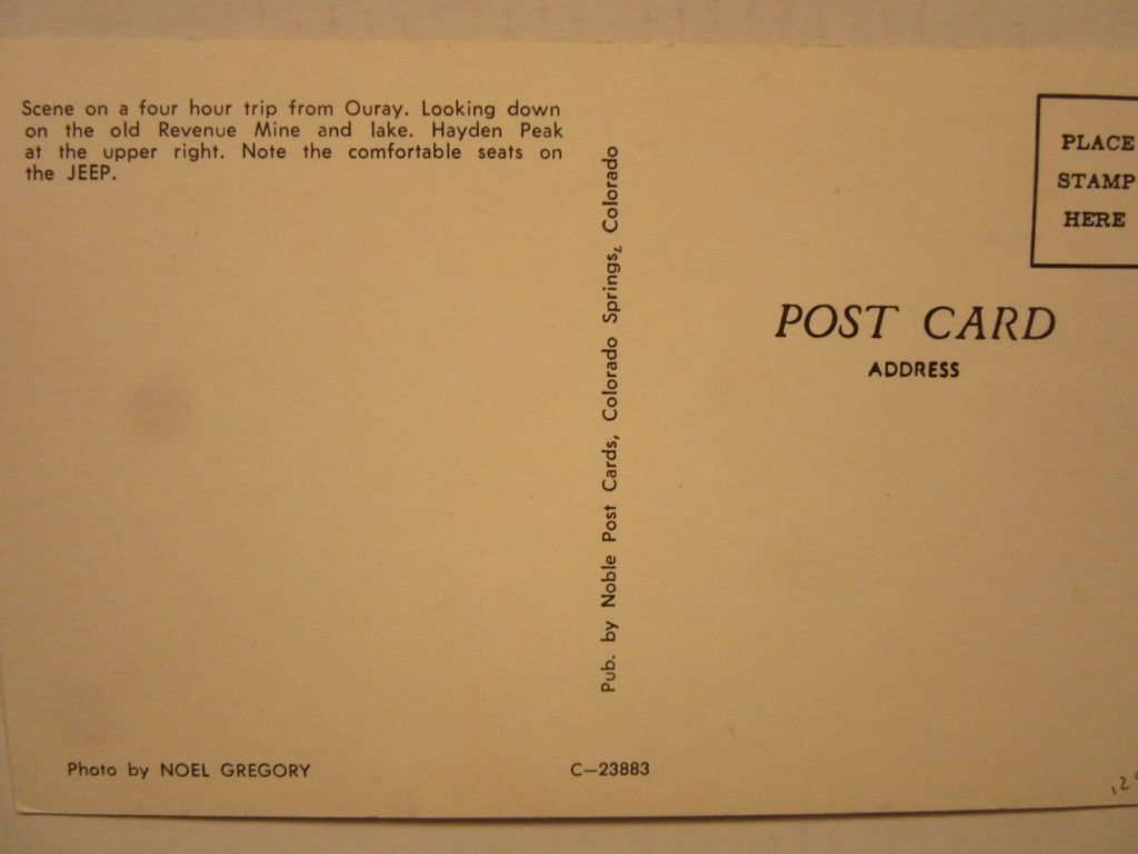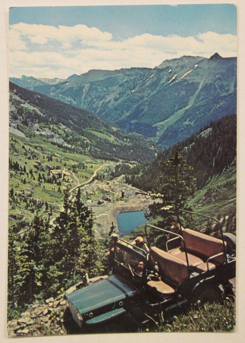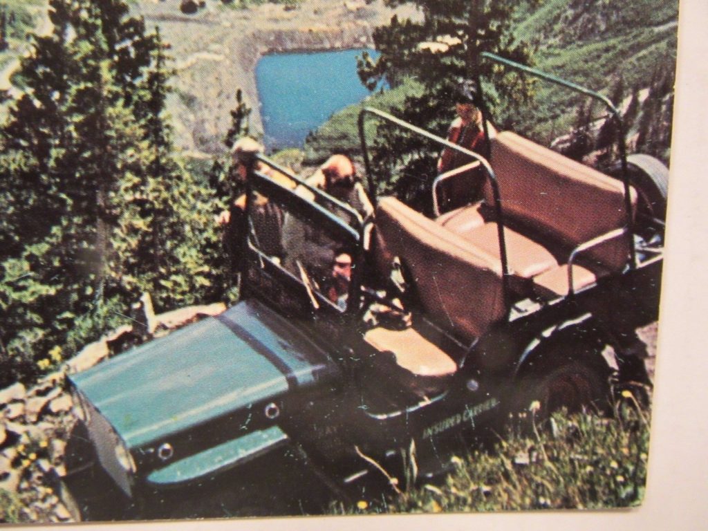 “A new color advertising postcard probably of SAN JUAN SCENIC JEEP TOURS of their early 1950’s Jeep CJ-5 with a lunch and coffee box mounted off the tailgate, very lightly bumped corners, no creases, no postmark. Crisp and clear. Nothing written on the back. About 3 1/2″ x 5 1/2″. Any glare or distortion is from my digital camera.”