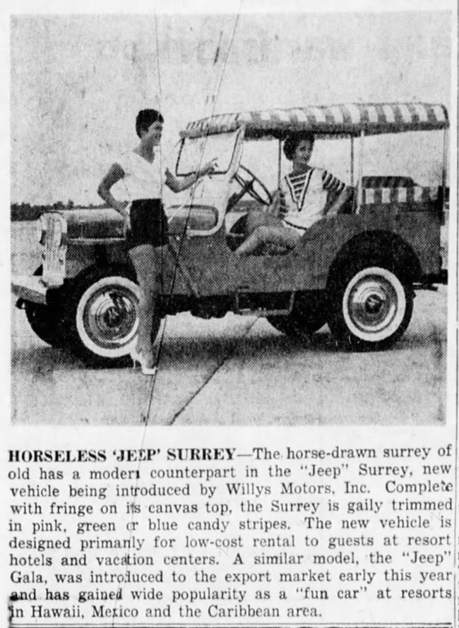 UPDATE: Here are a couple more articles introduction the Jeep Surrey. The first one notes that women will like it for its fashion while men will like it for its fine engineering. I’m less convinced that the term ‘fine-engineering’ should be applied to any of the DJ-3As.