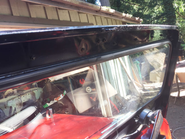 Next I addressed a couple of broken twisters. These are one of the unique features of a DJ-3A Convertible. The windshield is nearly like a CJ-3B, accept for the way the convertible top is supposed to attach to the windshield. Instead of a sliding mechanism, it uses those twisters. Two of Patterson’s twisters were broken. I had a few that I removed from Rusty (most of Rusty’s were broken), so I installed two of those onto Patterson. 2017-05-20-windshield3