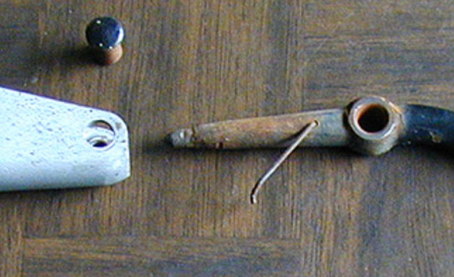 I began the morning with a simple task: remove the column shifter handle and replace it with Rusty’s.  The lever at the top is Rusty’s (it should be chrome rather than black, but that will have to wait). On the bottom is Patterson’s broken one. Patterson’s may be repairable, but it will take some time.