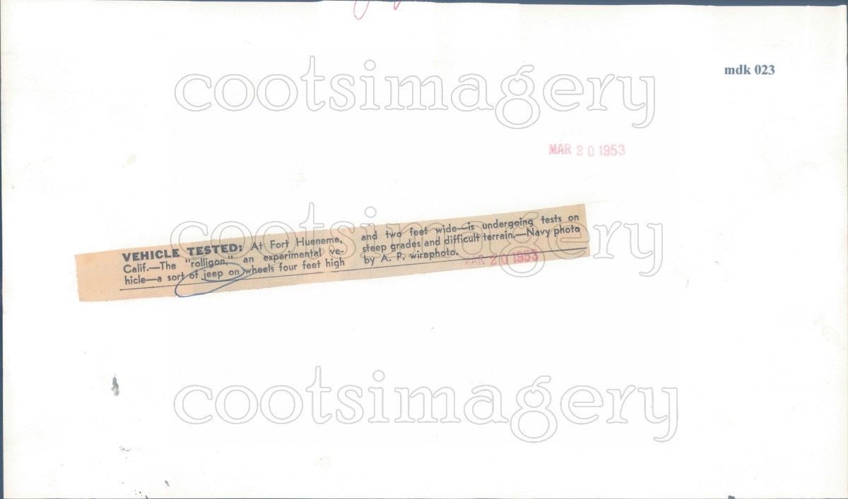 “1953 Press Photo Man Driving Albee Rolligon Jeep Like Vehicle. You are bidding on an original press photo of Man Driving Albee Rolligon Jeep Like Vehicle. Photo has a small light crease left edge & waving right side due to too much glue being used to attach the information sheet onto the back of the photo. Photo measures 6 x 10 inches and is dated 3/20/1953.”