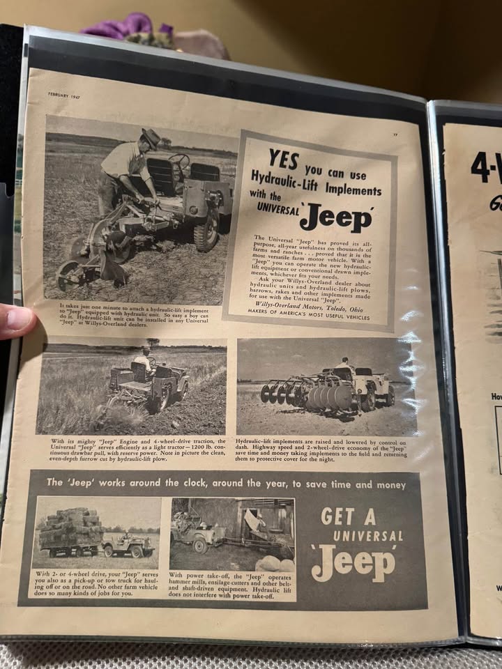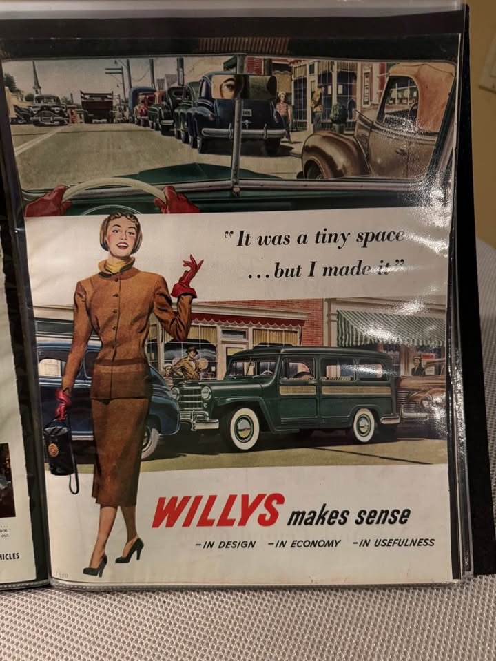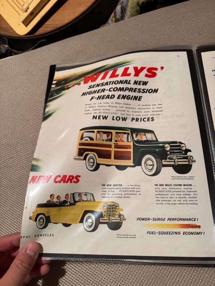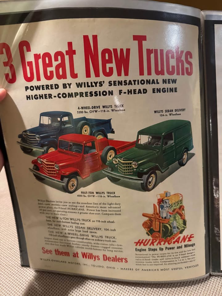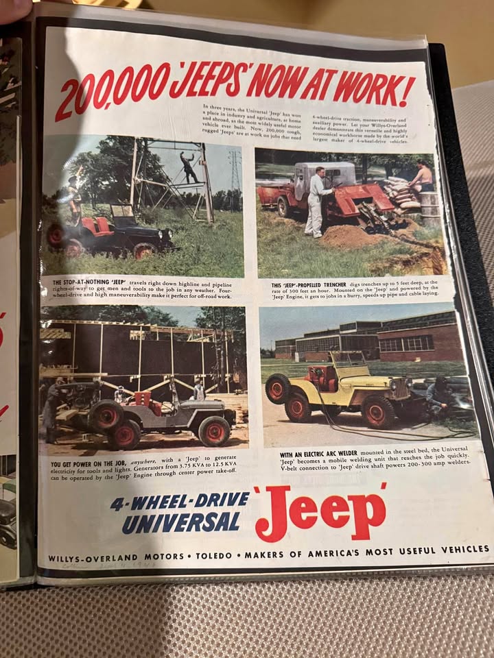 | Here is an art binder full of beautiful original advertisements! First page is “the new Jeep station wagon” 39 pages. Mostly Willy’s jeeps, pickups, wagons, and jeepster. One modern jeep. One two page Whippet ad from 1927. One two page ad for the Willy’s overland with no date. These are original ads. Local pick up in Washington Mo 63090 with cash, or I will ship on your dime if you can Pay with Venmo. |