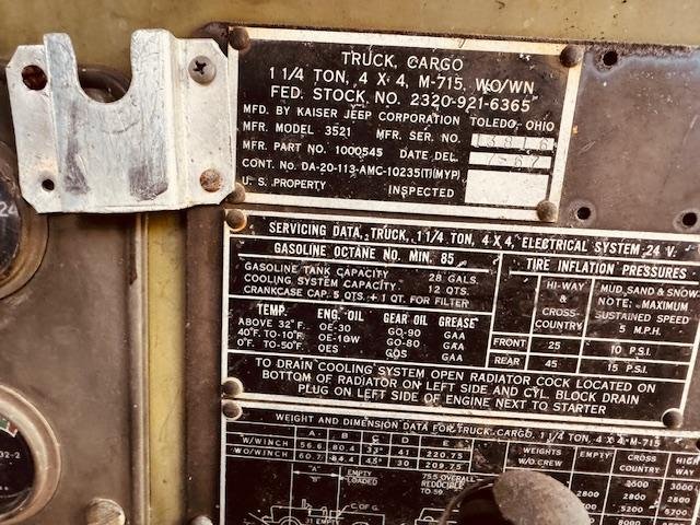 | 1967 KAISER JEEP M715, 1 1/4 TON MILITARY CARGO TRUCK ALL ORIGINAL EQUIPMENT NO BACK TIRES, RIMS THERE. NO TITLE |
