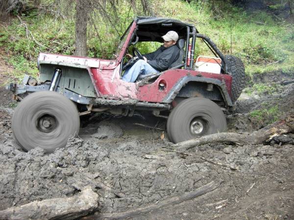 "Here's the series of pics…..That mud was real thick….In the process of rocking it back and forth I was making good progress of getting out….When the front end finally pulled the rear out of the hole, it immediately slid to the left and dropped the left front tire off the little ledge you can barely see in the pics. I had enough momentum and it was enough of a drop that the jeep just slowly flopped on the left side. No damage at all. The cage and tires were the only things that touched ground."