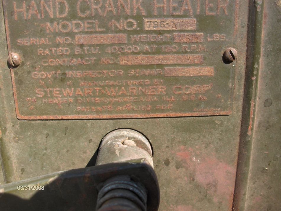 hi, i have in my possession a model …796-A hand crank heater, serial number 31.. weight 16 lbs,40,000btu at 120rpm,,manufactured by stewart warner, heater division, chicago ill. u.s.a. …… also stamped is i believe to be year of manufacture number… 472456-10-42.. it is in excellent condition with org paint and all parts org . i aquired it when i was cleaning out mydeceased Dad’s barn..he was in WW2 ..i have no use for it, and would hope like i read here that a ”willys jeep aficado would like for a collection or working ?? please contact me at …. larryv@vianet.ca i am in ontario canada.. the color is a sort of green,and or grey mix ?? but is org